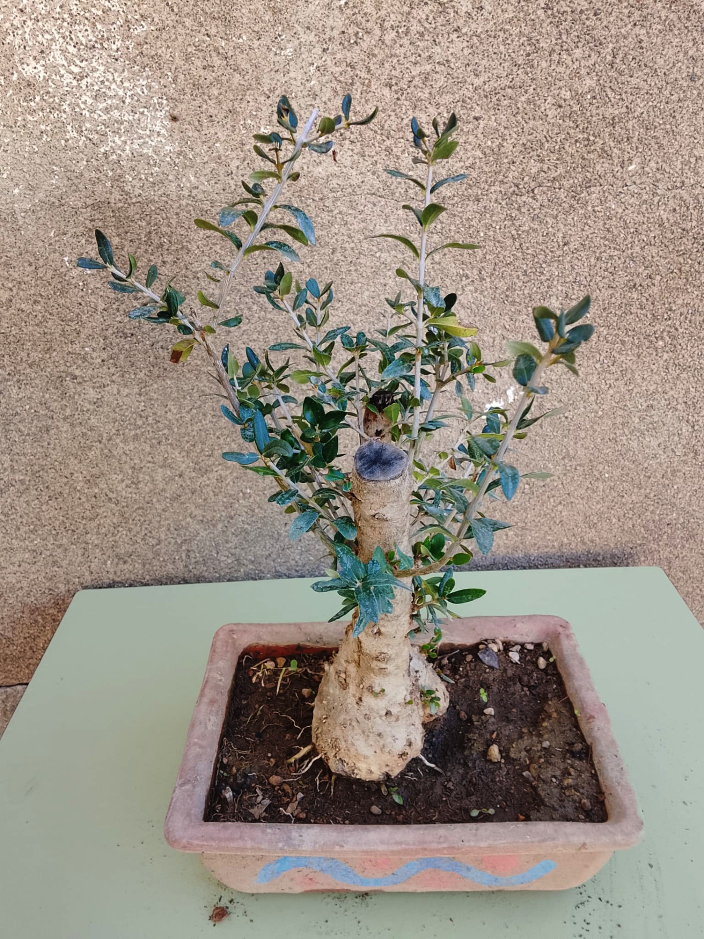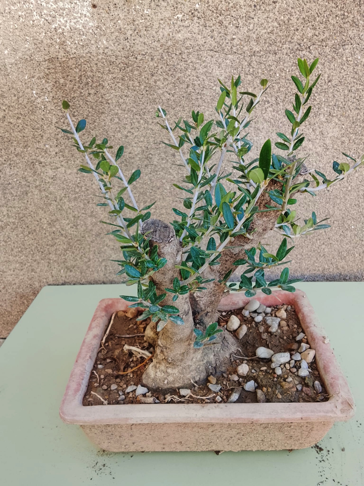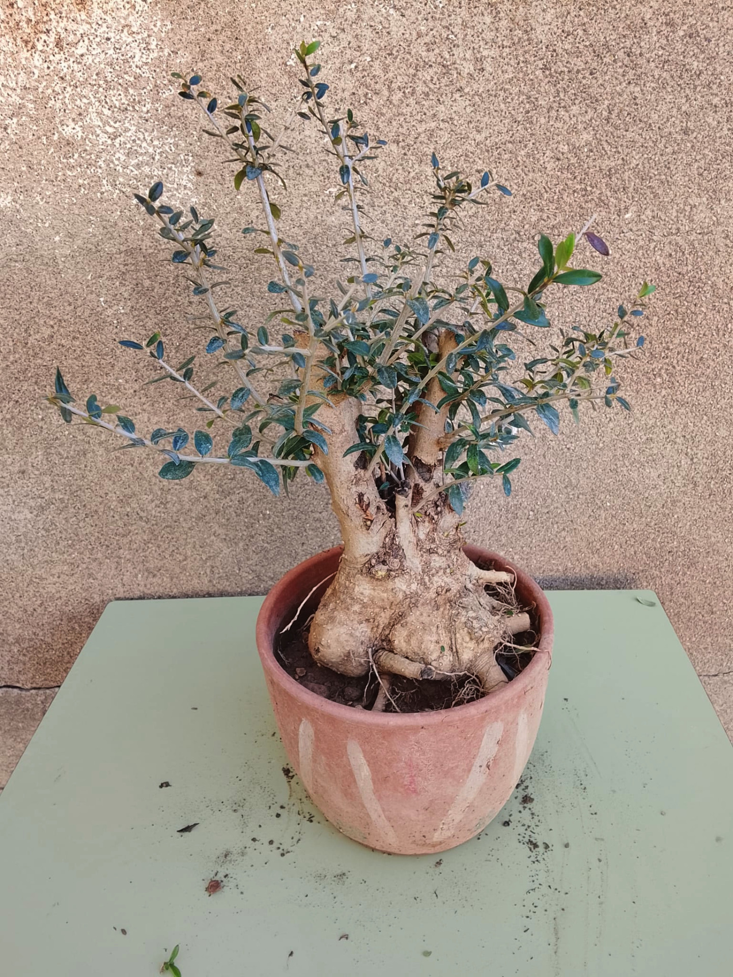 Bonsai de olivo milenario en maceta tiesto. Este bonsai de una edad aproximada de 12 años es Ideal para desarrollar tus habilidades. Su tamaño y peso aproximado es de: tronco de 34 cm. x altura de 30 cm. y maceta de 27x19x9 cm. con un peso total de 2 Kg.